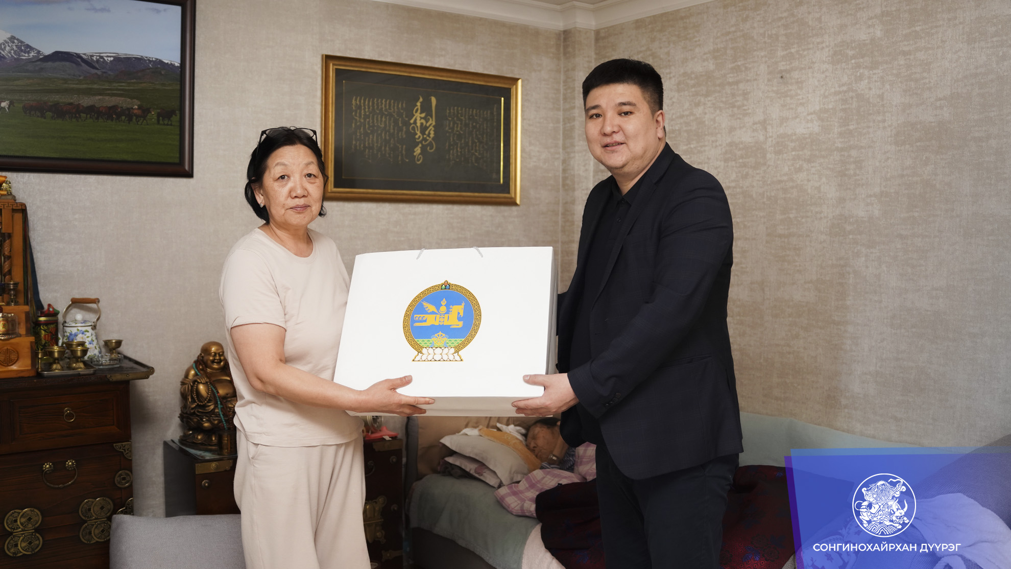 Эдгээр ахмадууддаа дүүргийн Засаг дарга Ц.Баттөр болон Засаг даргын орлогч Д.Хосбаяр нар ерөнхийлөгчийн явуулсан бэлгийг хүргэж өгөн хүндэтгэл үзүүллээ. Мөн дүүргийн зүгээс давхар гарын бэлэг гардуулан өглөө.